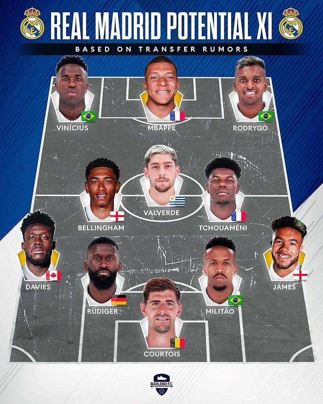 레알의 2024/25시즌 예상 베스트 11은 비니시우스 주니어, 킬리안 음바페, 호드리구, 주드 벨링엄, 페데리코 발베르데, 오렐리앙 추아메니, 알폰소 데이비스, 안토니오 뤼디거, 에데르 밀리탕, 리스 제임스, 티보 쿠르투아가 구성했다.