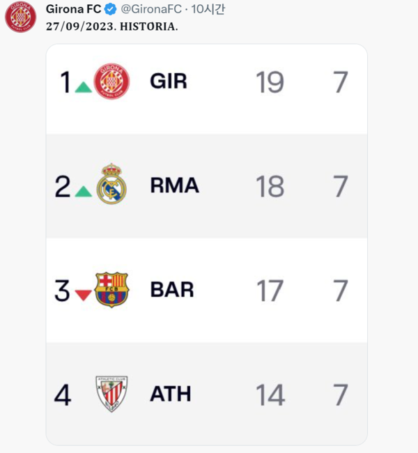 기존 강팀들이 부진에서 지로나에 기회가 온 것이 아니다. 2위 레알마드리드(승점 18), 3위 바르셀로나(승점 17)도 각각 6승 1패, 5승 2무로 선전하고 있는데, 지로나가 6승 1무로 성적이 더 잘하고 있을 뿐이다. 지로나는 1라운드 레알소시에다드 원정 경기 1-1 무승부 이후 6연승을 달리고 있다.