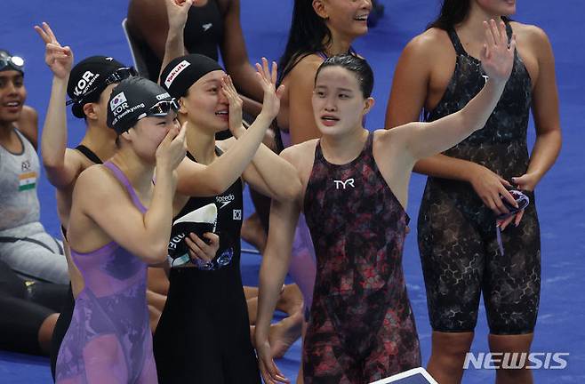 [항저우=뉴시스] 고승민 기자 = 28일 중국 항저우 올림픽 스포츠센터 수영장에서 열린 2022 항저우 아시안게임 수영 여자 800m 계영 결승 경기, 동메달을 획득한 한국 김서영, 허연경, 박수진, 한다경이 기쁨의 눈물을 흘리고 있다. 2023.09.28. kkssmm99@newsis.com
