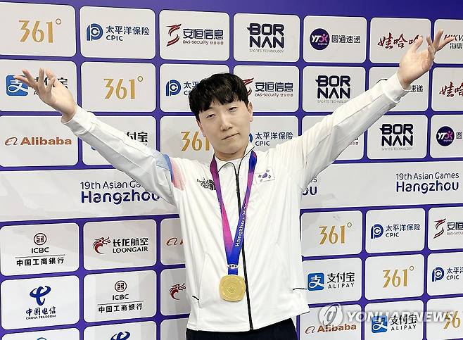 (항저우=연합뉴스) 안홍석 기자 = 28일 중국 항저우 e스포츠센터에서 열린 2022 항저우 아시안게임(AG) 스트리트 파이터 V 결승전에서 대만의 샹여우린을 세트 점수 4-3으로 물리치고 금메달을 획득한 뒤 공동취재구역(믹스트존)에서 취재진을 향해 포즈를 취하고 있다. 2023.9.28