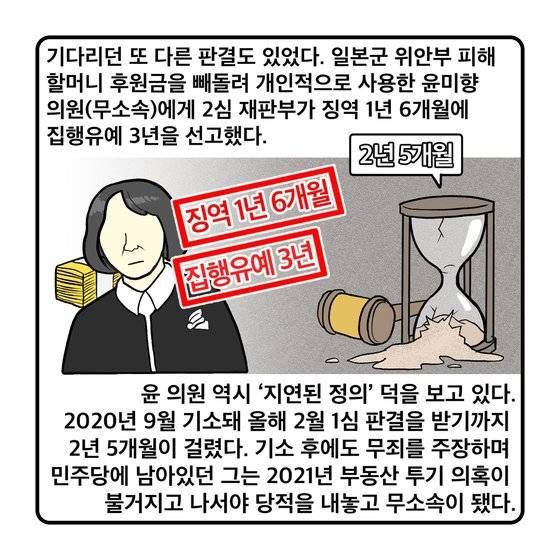 윤 의원 역시 ‘지연된 정의’ 덕을 보고 있다. 2020년 9월 기소돼 올해 2월 1심 판결을 받기까지 2년 5개월이 걸렸다. 기소 후에도 무죄를 주장하며 민주당에 남아있던 그는 2021년 부동산 투기 의혹이 불거지고 나서야 당적을 내놓고 무소속이 됐다. 최근 2심까지 3년이 소요됐는데 대법원에서 신속한 재판이 이뤄지지 않는 한 의원 임기를 다 채우게 된다. 재판이 늦어지는 동안 윤 의원은 지난달 친북 단체 조총련 등이 주최한 간토대지진 100주년 행사에까지 참여하는 등 논란이 되는 활동을 하고 있다. 개인 자격이라고 했지만 주일 한국 대사관으로부터 대사관 차량을 제공받았다.