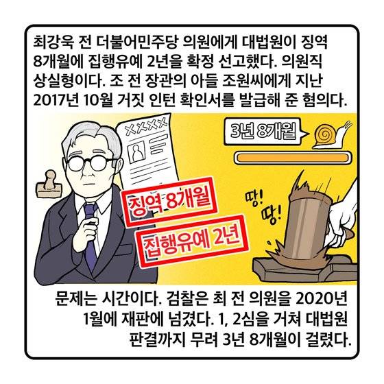 문제는 시간이다. 검찰은 최 전 의원을 2020년 1월에 재판에 넘겼다. 1, 2심을 거쳐 대법원 판결까지 무려 3년 8개월이 걸렸다. 최 전 의원은 기소된 상태에서 2020년 4월 열린민주당 비례대표로 총선에 출마해 21대 국회의원이 됐다. 대법원에서만 1년 4개월이 걸리는 등 재판이 늦어지면서 4년 임기 중 7개월만을 남긴 3년 5개월간 의정 활동을 했다. 그는 지난달 국회 법제사법위원회에서 한동훈 법무부 장관에게 “깐죽거리지 말라”고 하는 등 현 정부에 대한 저격수 역할을 자처했다.