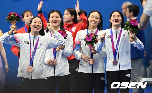 경기 종료 후 한국 대표팀 김서영, 박수진, 한다경, 허연경이 기뻐하고 있다. 한국 대표팀은 8분00초11을 기록, 동메달을 목에 걸었다. 2023.09.28 / ksl0919@osen.co.kr