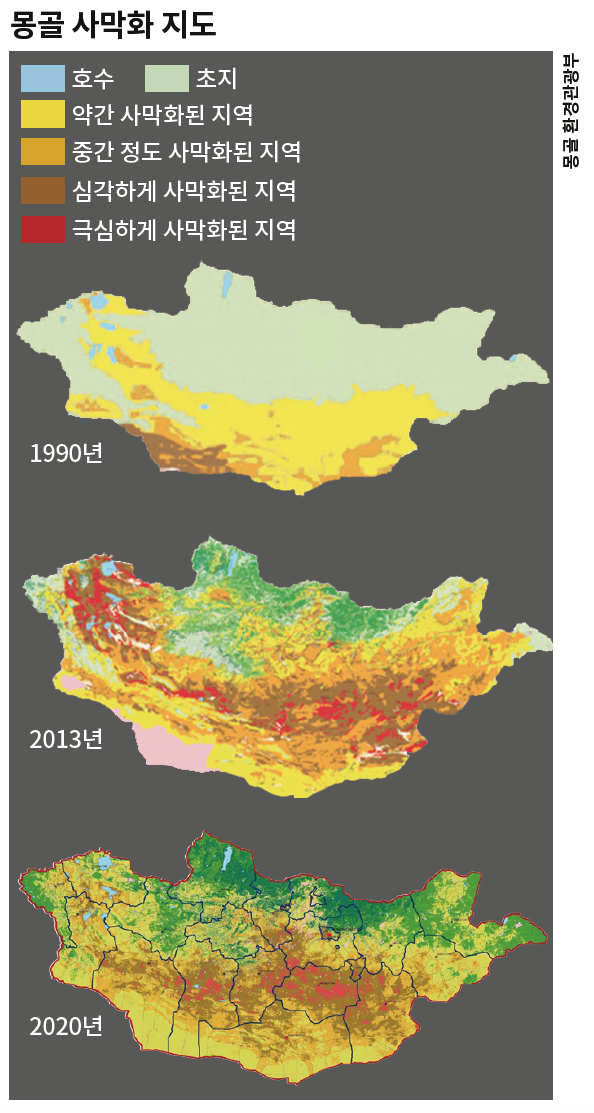 이처럼 기후위기, 과도한 목축업, 광산 개발의 결과, 전체 몽골 면적의 76.9%가 사막화되었다(〈그림〉 참조). 전체 산림 면적은 8% 이하로 줄어들었고, 호수와 연못 1166개, 강 887개, 개천 2096개, 온천 60개가 사라졌다. 몽골 남부에 있는 울란 호수는 서울의 절반 크기인데, 한때 흔적도 없이 사라지는 바람에 몽골을 충격에 빠뜨리기도 했다.