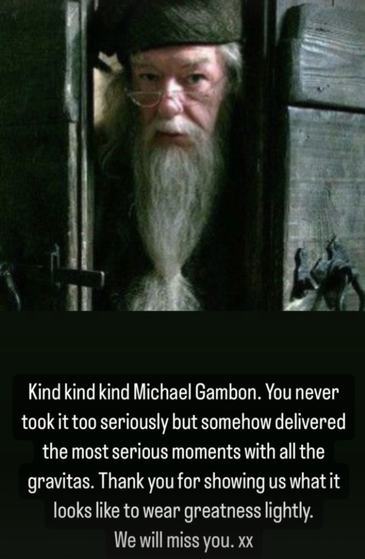 그런가하면 왓슨은 '해리포터' 시리즈 중 한 편인 '아즈카반의 죄수' 속 갬본의 이미지를 공유하며 "친절하고 친절한 마이클 갬본. 당신은 결코 심각하지 않게 진지한 순간을 전달했다. 감사하다. 가볍게 위대함을 입는 모습을 보여주셔서. 보고싶다"라며 그리움을 표했다.