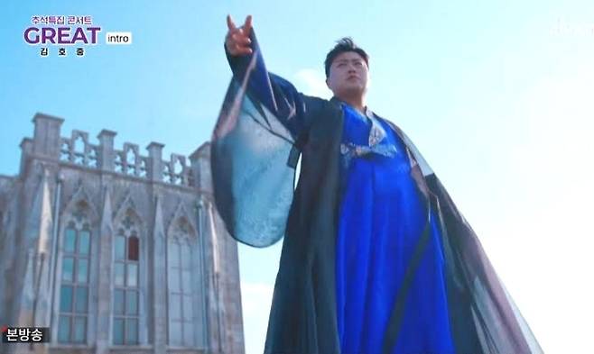 이날 방송은 시작부터 남다른 스케일을 자랑했다. 경희대학교 평화의 전당 지붕 위에서 한복을 입고 등장한 김호중의 모습으로 시작된 'GREAT 김호중'은 '바람남'으로 공연의 시작을 알렸다. 지붕이 갈라지는 듯한 CG부터 하늘에서 내려오는 리프트까지 더해지며 압도적인 스케일을 자랑했다.