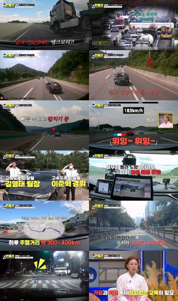 또한 한문철 변호사는 장시간 운전하는 귀성길을 생각해 고속도로 졸음운전으로 인해 벌어진 사고 영상을 공개했다. 특히 졸음운전을 한 탱크로리가 가드레일과 부딪친 후 휘청거리다가 차량 한 대를 덮치곤 모든 차로를 막아선 사고에 패널들 모두 경악을 금치 못했다. 이 밖에도 졸음운전 차량이 후미를 추돌해 화물차가 전도된 사고와 졸음쉼터에서 나와 방향지시등 없이 도로에 합류해 발생한 사고까지 다양한 사고가 소개됐다. 이에 이수근은 "빨리 가려고 하지 말고 컨디션 좋은 날 가시길"라며 장거리 주행 시 졸음운전을 유념할 것을 강조했다.