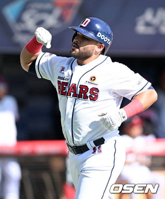 1회말 1사 1루에서 두산 로하스가 우월 투런 홈런을 치고 홈에서 환호하고 있다. 2023.09.29 /sunday@osen.co.kr