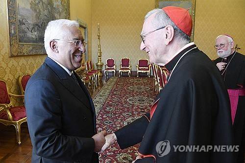 epa10889165 A handout photo made available by the Vatican Media shows Vatican Secretary of State Cardinal Pietro Parolin (R) shaking hands with Portuguese Prime Minister Antonio Costa at the Vatican, 28 September 2023 (issued 29 September 2023). EPA/VATICAN MEDIA HANDOUT EDITORIAL USE ONLY/NO SALES