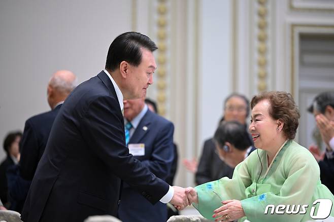 (서울=뉴스1) 오대일 기자 = 윤석열 대통령이 29일 청와대 영빈관에서 열린 원폭 피해 동포 초청 오찬 간담회에서 김화자 전 민단 부인회 히로시마현 본부 부회장과 악수하고 있다. (대통령실 제공) 2023.9.29/뉴스1