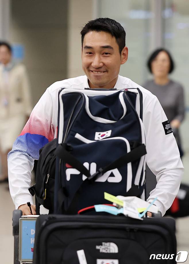 (인천공항=뉴스1) 김진환 기자 = 항저우 아시안게임 펜싱 남자 사브르 단체전에서 금메달을 획득한 김정환이 29일 오후 인천국제공항 제2터미널을 통해 귀국하고 있다. 2023.9.29/뉴스1