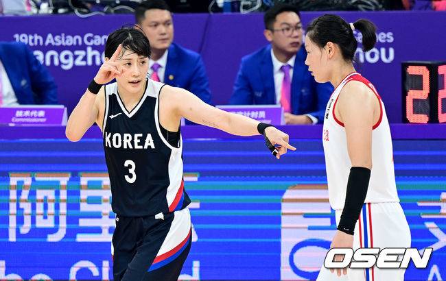 [OSEN=항저우(중국), 최규한 기자] 29일 오후 중국 항저우 올림픽 스포츠 센터 체육관에서 열린 ‘2022 항저우 아시안게임’ 여자농구 조별리그 C조 2차전 대한민국과 북한의 경기, 한국이 81-62로 북한을 꺾고 승리했다.