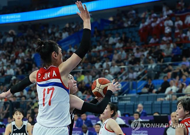 (항저우=연합뉴스) 홍해인 기자 = '민족의 명절' 한가위인 29일 중국 저장성 항저우의 올림픽 스포츠센터에서 열린 2022 항저우 아시안게임 여자 농구 대한민국과 북한의 경기.