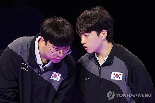 (항저우=연합뉴스) 신현우 기자 = 29일 중국 저장성 항저우 e스포츠 센터에서 열린 제19회 항저우 아시안게임 e스포츠 리그 오브 레전드(LoL) 결승에서 대만과의 경기를 앞두고 '룰러' 박재혁과 '케리아' 류민석이 대화하고 있다. 2023.9.29