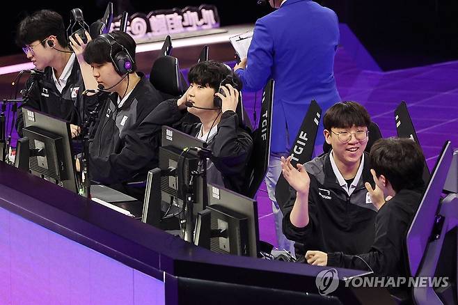 (항저우=연합뉴스) 신현우 기자 = 29일 중국 저장성 항저우 e스포츠 센터에서 열린 제19회 항저우 아시안게임 e스포츠 리그 오브 레전드(LoL)에서 결승에서 대만을 상대로 승리히며 금메달을 확정지은 뒤 '룰러' 박재혁과 '케리아' 류민석이 기뻐하고 있다. 2023.9.29