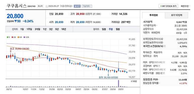 이 종목은 렌털사업에서 두각을 보이고 있는 쿠쿠홈시스. 드라마 ‘킹더랜드’로 전국구 스타로 거듭난 이준호가 광고 모델이다. 30일 한국거래소에 따르면 주가는 2만800원. 1년 전(2022년 9월 30일 2만8100원)에 비해 25.98% 빠졌다. 이 기간 주가 하락은 안정적인 실적에도 2차전지·반도체·AI(인공지능) 업종에 비해 성장성이 돋보이지 않았기 때문인 것으로 보인다.