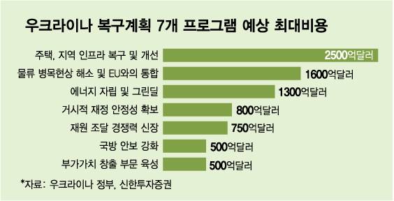 김선미 신한투자증권 연구원은 "최근 건설사들의 해외부문에 대한 의지가 다시 높아지고 있는데 다양한 기회들이 확인되고 있기 때문"이라며 "한국 정부는 국내 재건사업 기회가 520억달러(한화 약 70조원) 수준이라 추산했고 운송, 에너지, 전력, 모듈러 건축 등이 주요타겟"이라고 말했다. 이어 "우크라이나 정부의 직접적인 참여 요청이 있었던 만큼 국내 건설사 수혜 가능성은 크다"면서도 "외부투자 및 지원금에 의존하는 만큼 우크라이나 재건사업 속도는 더딜 전망"이라고 덧붙였다.