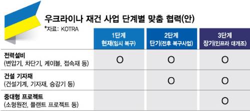 코트라(KOTRA) 키이우 무역관은 "우크라이나가 신속한 임시복구→전후 복구사업→인프라 대개조 등 3단계 재건 프로젝트를 제시한 만큼, 추진 단계를 고려해 우크라이측 수요 맞춤형 협력 전략을 수립할 필요가 있다"고 강조했다.