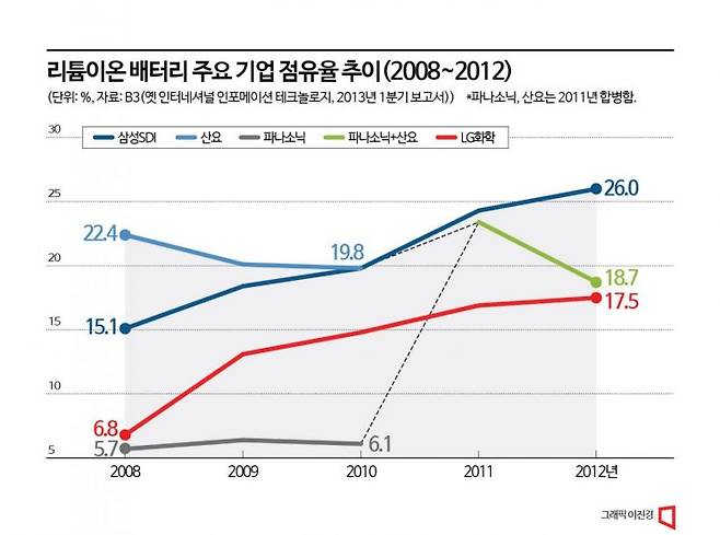 이듬해가 되자 한국 기업들이 전 세계 리튬이온배터리 시장에서 일본을 제쳤다는 통계들이 잇따라 발표됐다. 2011년 3월 일본 시장조사기관인 인터내셔널 인포메이션 테크놀로지(IIT)는 2차전지 시장에서 삼성SDI가 20.0%의 점유율로 산요(19.3%)를 제치고 1위에 올랐다고 발표했다. 3위는 LG화학(15.0%), 4위는 소니(11.9%)였다.