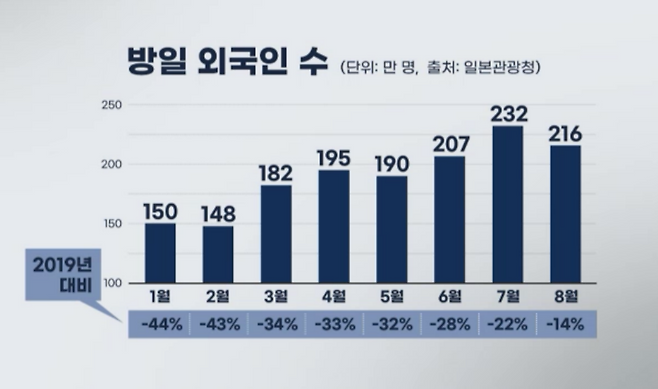 일본 관광청 발표를 보면 일본을 찾은 외국인은 지난달 215만 명으로 석 달째 200만 명을 넘었습니다. 특히 지난달에는 코로나 이전 대비 -14%로 과거와 격차가 상당히 좁혀졌습니다.