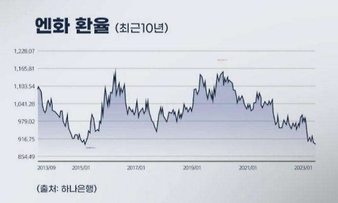 지난 10년간 엔화 환율의 흐름을 보면, 불과 3년 전에는 1,100 원 이상에도 거래됐었는데 그때와 비교하면 20% 이상 엔화 가치가 내려갔습니다. 지난 6월 8년 만에 800원대로 내려간 이후 잠시 반등했다가 지난주 다시 800원대에 거래된 것입니다.