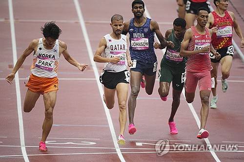 South Korea's Park Jonghak and Qatar's Mohamad Algarni crosses the finish line during the men's 1500-meter heat at the 19th Asian Games in Hangzhou, China, Saturday, Sept. 30, 2023. (AP Photo/Vincent Thian )