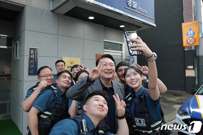 (서울=뉴스1) 안은나 기자 = 윤석열 대통령이 추석 연휴인 30일 서울 중부경찰서 을지지구대를 방문해 현장 경찰관들과 셀카를 찍고 있다. (대통령실 제공) 2023.9.30/뉴스1