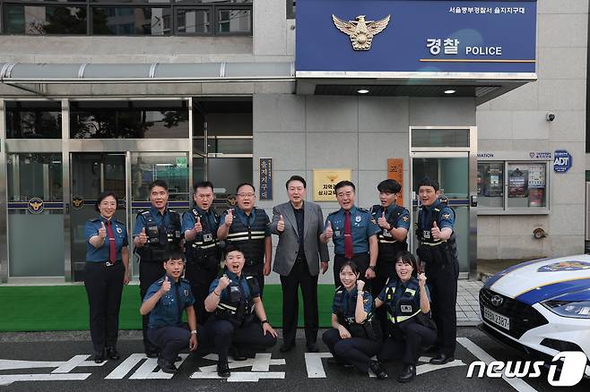 (서울=뉴스1) 안은나 기자 = 윤석열 대통령이 추석 연휴인 30일 서울 중부경찰서 을지지구대를 찾아 경찰들과 기념 촬영하고 있다. (대통령실 제공) 2023.9.30/뉴스1