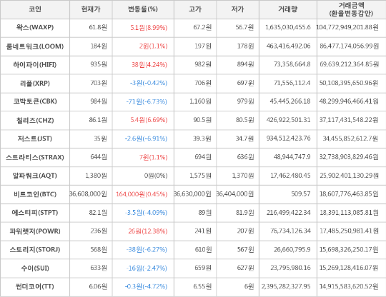 또한, 왁스(8.99%, 61.8원), 칠리즈(6.69%, 86.1원), 하이파이(4.24%, 935원), 룸네트워크(1.1%, 184원), 스트라티스(1.1%, 644원)가 상승세를 나타냈다.