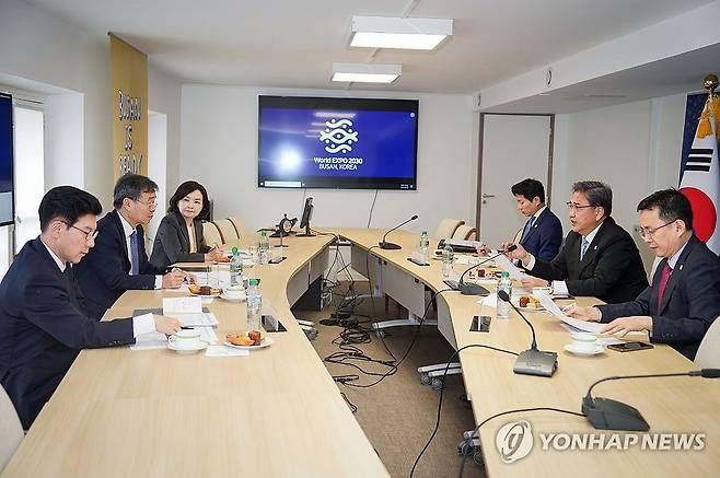 (서울=연합뉴스) 박진 외교부 장관이 29일(현지시간) 국제박람회기구(BIE)가 있는 프랑스 파리를 방문해 최재철 주프랑스 한국 대사, 최상대 OECD 대사, 박상미 유네스코 대사와 함께 2030부산엑스포 유치 성공을 다짐하고 있다. 2023.9.30 [외교부 제공. 재판매 및 DB 금지]