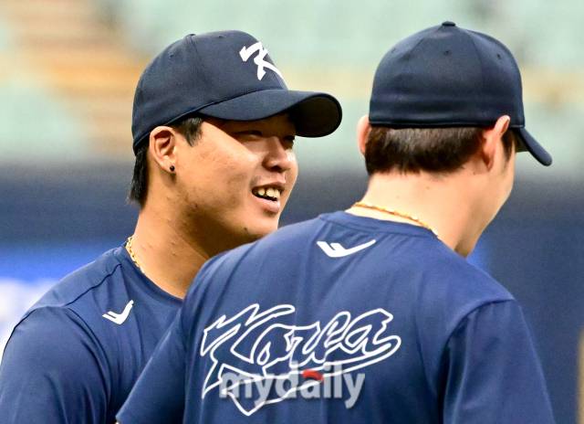 그런데 그런 그가 대표팀 유니폼을 입고 드디어 웃기 시작했다. 그동안 많은 국제대회에서 함께 했던 김혜성과 장난치며 환하게 웃는 모습이 포착됐다.