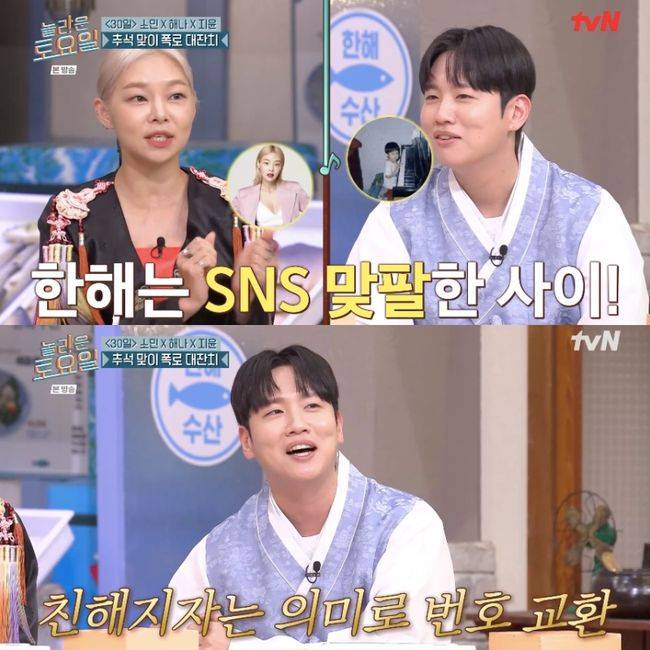 그 말에 도레미는 “끼부리는 거다”, “번호 달라고 하는 방법이다”라고 했고, 박나래는 “아주 추잡스러운 방법이다”라고 한해를 몰아갔다. 이에 한해는 “누나 예전부터 많이 봤는데 앞으로 친해지자는 의미로 번호 교환을 하자고 한 거다”라고 해명했다. 송해나는 “번호 교환 했는데 제가 ‘저장 완료 했습니다. 선생님’이라고 했다. 그 이후로 한 번도 문자나 연락을 해본 적이 없다. 그 이후로 처음 본 거다”라며 친해지고 싶다고 밝혔다. 이를 들은 엄지윤은 “뭐야 사랑 이야기네”라며 설렘을 드러냈다.