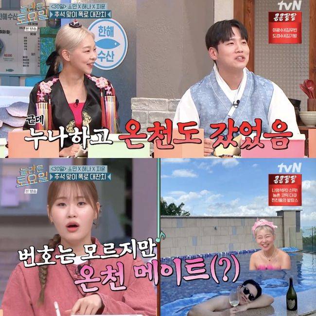 그러자 한해는 “저 누나(송해나)하고 예전에 온천도 간 적이 있다”라고 밝혀 놀라움을 안겼다. 도레미는 “촬영 차 갔냐, 여행을 갔냐”라며 캐물었고, 태연은 “문화 충격”이라며 입을 다물지 못했다. 송해나는 “수영복 입었다. 래쉬가드 입고 들어 간거다”라고 답변했고, 한해는 “촬영 때문이었지만 같이 탕에 들어간 적이 있는 사이다”라고 강조했다. 이에 키는 “얼추 친해지면 여행 가는 줄 알았다”라고 반응해 폭소케 했다.