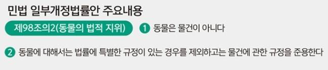 동물의 비물건화 민법 개정안은 2017년 7월 입법예고 2년여만인 지난 7월13일 법사위 법안1소위에 상정됐지만 아직까지 제대로 논의되지 못하고 있다.