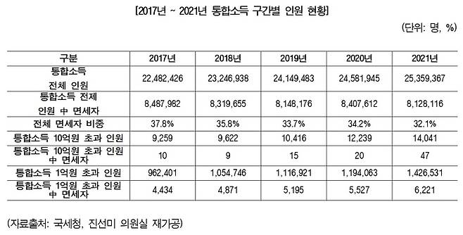2020년 전체 통합소득자 2458만1945명 중 면세자 총인원은 840만7612명으로 전체 소득자 대비 면세자 비중은 34.2% 수준이었다. 1년간 전체 면세자 수는 812만8116명으로 줄어 전체 소득자 대비 비중은 32.0%로 낮아졌다. 전체 소득구간의 면세자 비중은 줄어들고 있으나 반면 1억원 이상 소득자 중 면세자 수는 늘어나고 있는 추세가 확인된다.