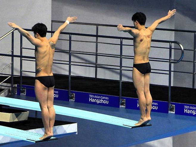 | ▲ 9월 30일 저녁 항저우 스포츠 파크 수영장에서 열린?남자 싱크로 3m 스프링보드에서 우하람(왼쪽)과 이재경(오른쪽)이 뒤돌아 서서 도약을 준비하고 있다. |