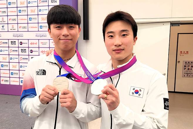 | ▲ 9월 30일 저녁 항저우 스포츠 파크 수영장에서 열린 남자 싱크로 3m 스프링보드에서 은메달을 딴 (왼쪽부터)이재경과 우하람이 메달을 들어보이고 있다. |