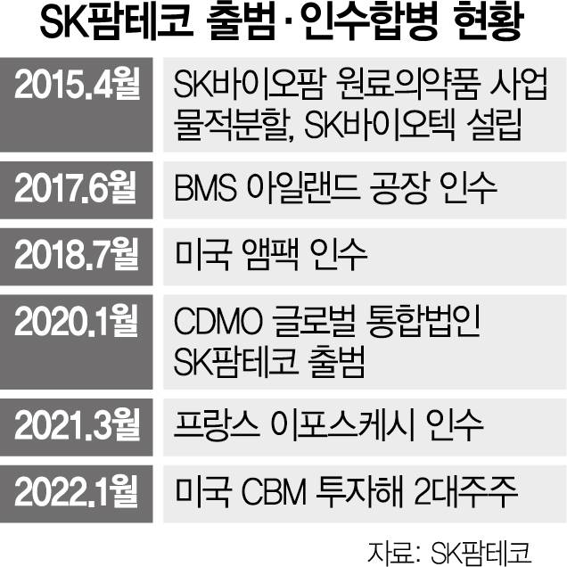 미국·유럽에 걸쳐 기술 및 치료제 생산 역량 확보를 위한 해외 투자도 활발히 해왔다. 2017년 SK팜테코의 국내 자회사인 SK바이오텍을 통해 글로벌 제약사 브리스톨마이어스스큅(BMS)의 아일랜드 공장(현 SK바이오텍 아일랜드)을 인수한 데 이어 2018년 미국 원료 의약품 기업 앰팩도 인수했다.