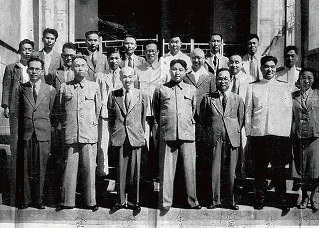 | ▲ 1948년 북한 초대 내각 사진. 앞줄 왼쪽 네 번째가 김일성이다. |
