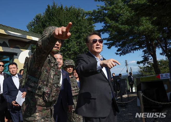[연천=뉴시스] 전신 기자 = 윤석열 대통령이 1일 경기도 연천군 육군 제25사단 상승전망대를 찾아 최성진 사단장으로부터 제1땅굴에 대한 설명을 듣고 있다. (대통령실통신사진기자단) 2023.10.01. photo1006@newsis.com