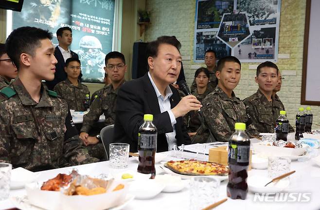 [연천=뉴시스] 전신 기자 = 윤석열 대통령이 1일 경기도 연천군 육군 제25사단 한 소초를 찾아 장병들과 간담회를 하고 있다. (대통령실통신사진기자단) 2023.10.01. photo1006@newsis.com