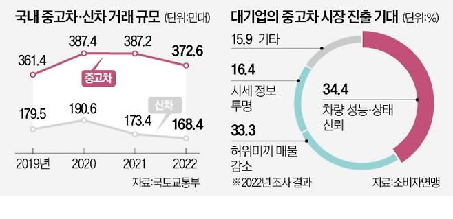 그간 국내 완성차 업체는 연간 30조~40조원에 이르는 중고차 시장에 진입할 수 없었다. 중고차 매매업이 '골목상권을 침해한다'는 이유로 생계형 적합 업종으로 지정돼 대기업의 진출이 불가능했기 때문이다. 국내에 진출한 수입차 브랜드 20여 곳이 이미 직접 인증한 중고차를 팔고 있는 것과 달리 국내 기업들은 중고차 시장을 바라만 봐야 했던 이유다.
