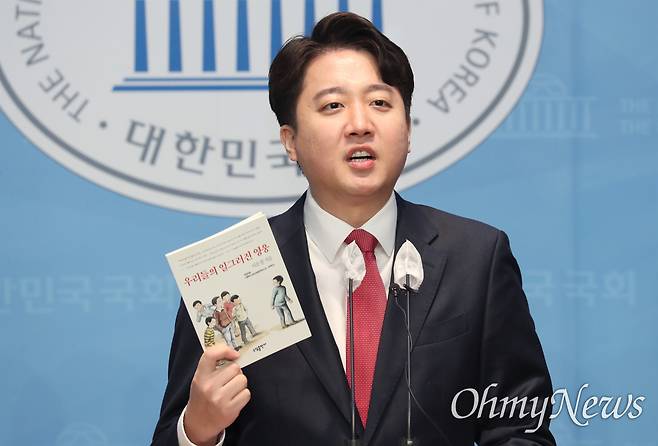 | ▲ 이준석 국민의힘 전 대표가 2023년 3월 3일 서울 여의도 국회 소통관에서 전당대회 등 현안 관련 기자회견을 하며 소설 <우리들의 일그러진 영웅>을 들어 보이고 있다. |
