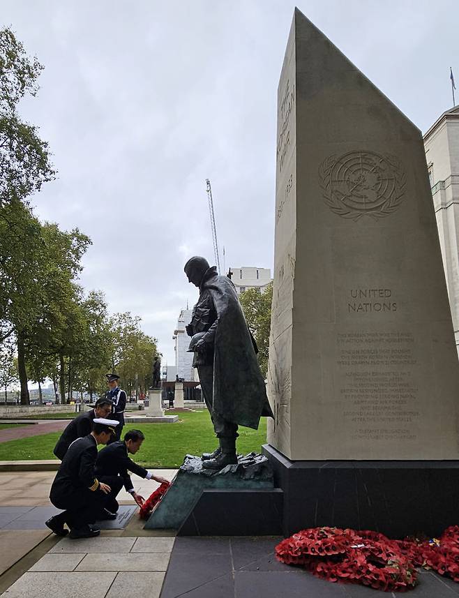 [서울=뉴시스] 조성우 기자 = 영국, 독일을 방문 중인 김영호 통일부 장관이 1일 오전(현지시간) 영국 런던의 '한국전 참전 기념비'를 찾아 헌화하고 있다. (사진=통일부 제공) 2023.10.01. photo@newsis.com *재판매 및 DB 금지