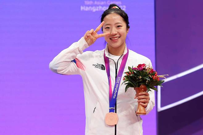 [서울=뉴시스] 조성우 기자 = 1일 중국 항저우 궁수 캐널 스포츠파크 체육관에서 열린 2022 항저우 아시안게임 탁구 여자 단식 시상식에서 신유빈이 동메달을 목에 걸고 포즈를 취하고 있다. (사진=대한탁구협회 제공) 2023.10.01. photo@newsis.com *재판매 및 DB 금지