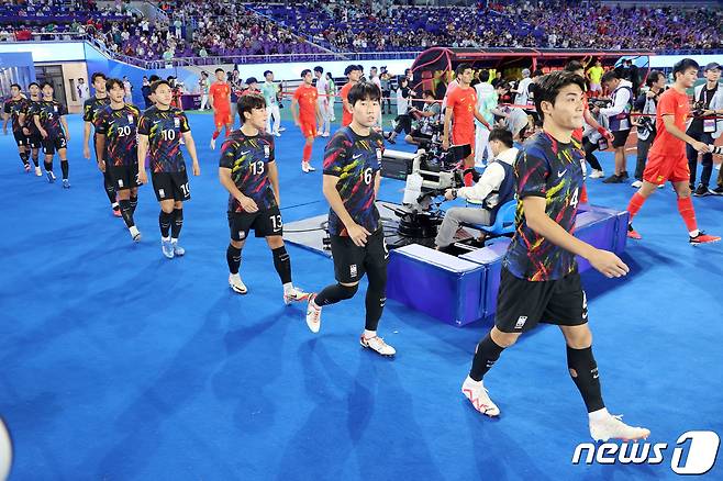 (항저우(중국)=뉴스1) 민경석 기자 = 1일 오후 중국 항저우 황룽 스포츠센터 스타디움에서 열린 2022 항저우 아시안게임 대한민국과 중국의 축구 8강전에서 선수들이 입항하고 있다. 2023.10.1/뉴스1