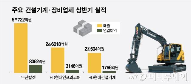 2일 금감원 전자공시에 따르면 주요 건설기계·장비업체는 올 상반기 괄목할만한 성적을 거뒀다. 두산밥캣은 5조722억원의 매출을 올리며 8362억원의 영업이익을 실현했다. HD현대인프라코어는 상반기 매출액 2조6018억원, 영업이익 3146억원을 달성했다. HD현대건설기계도 매출 2조504억원, 영업이익 1766억원 등을 나타냈다. HD현대·두산그룹의 전체 영업이익 가운데 절반 이상이 건설기계·장비 사업에서 나올 정도로 내부 위상이 높아졌다.