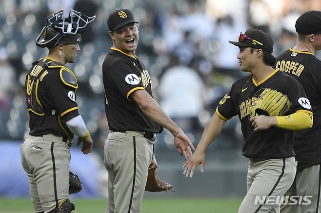 [시카고=AP/뉴시스] 샌디에이고 파드리스의 김하성(오른쪽)이 1일(현지시각) 미 일리노이주 시카고의 개런티드레이트필드에서 열린 2023 메이저리그(MLB) 시카고 화이트삭스와 경기를 승리로 마친 후 동료들과 자축하고 있다. 김하성은 연장 10회 초 희생플라이 타점을 올리며 올 시즌 마지막 경기에서 4타수 무안타 1타점을 기록했고 팀은 연장 11회 끝에 2-1로 승리했다. 2023.10.02.