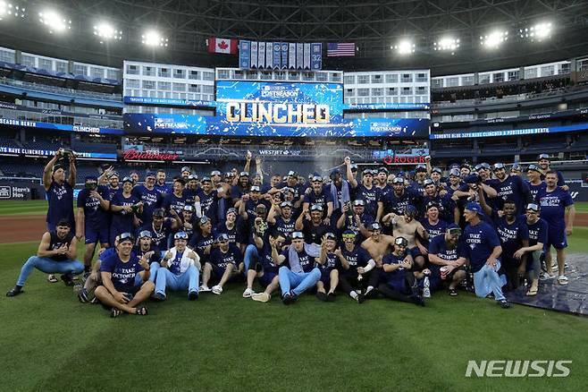 [토론토=AP/뉴시스] 토론토 블루제이스 선수들이 1일(현지시각) 캐나다 오타와주 토론토의 로저스 센터에서 열린 2023 메이저리그 탬파베이 레이스와의 경기 후 포스트시즌 진출을 자축하고 있다. 토론토는 이날 탬파베이에 8-12로 패했으나 와일드카드 3위로 포스트시즌에 진출해 미네소타 트윈스와 3전 2승제 경기를 치르게 된다. 2023.10.02.