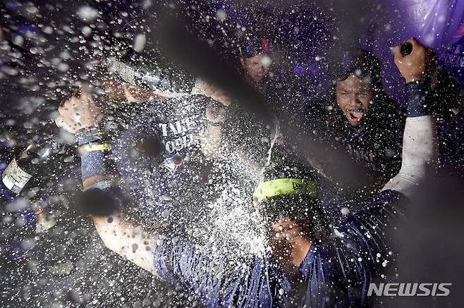 [토론토=AP/뉴시스] 토론토 블루제이스의 블라디미르 게레 주니어(오른쪽)가 1일(현지시각) 캐나다 오타와주 토론토의 로저스 센터에서 열린 2023 메이저리그 탬파베이 레이스와의 경기 후 동료들과 라커룸에서 포스트시즌 진출을 자축하고 있다. 토론토는 이날 탬파베이에 8-12로 패했으나 와일드카드 3위로 포스트시즌에 진출해 미네소타 트윈스와 3전 2승제 경기를 치르게 된다. 2023.10.02.